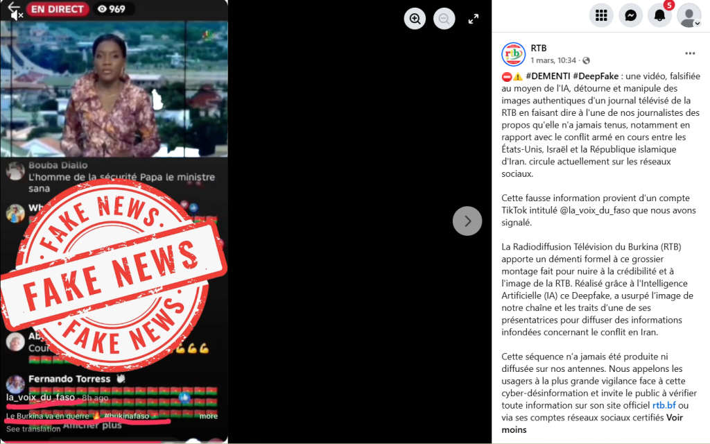 Après la diffusion de la vidéo devenue virale sur les réseaux sociaux, la Radiodiffusion Télévision du Burkina (RTB) a démenti l’information dans un communiqué publié sur sa page Facebook, le 1er mars. Selon elle, il s’agit d’un contenu manipulé au moyen de l’intelligence artificielle, à partir des images authentiques d’une ancienne session du journal télévisé, pour faire tenir à l’une de ses journalistes des propos qu’elle n’a jamais prononcés, en lien avec le conflit armé impliquant les États-Unis, Israël et l’Iran.