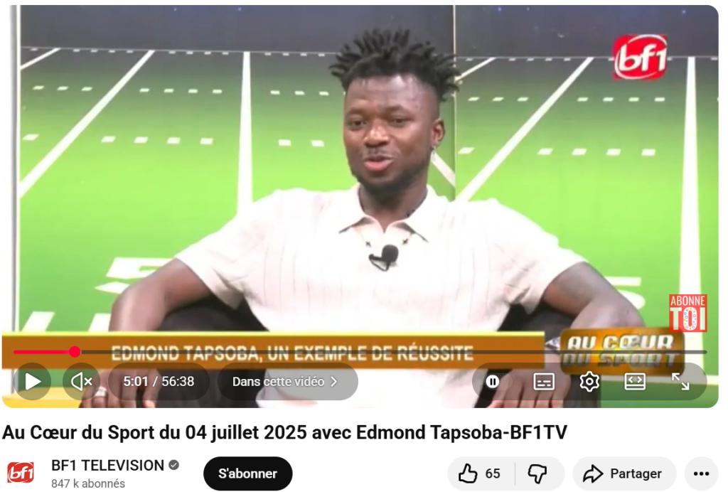 Dans la vidéo de 56mn39s diffusée par BF1, il n’a nullement été question de promotion de jeu mobile. Dans l’émission, le footballeur était vêtu d’un tee-shirt blanc vierge. Dans la vidéo manipulée, le logo de la plateforme “Penalty duel” a été apposé sur le vêtement d’Edmond Tapsoba.