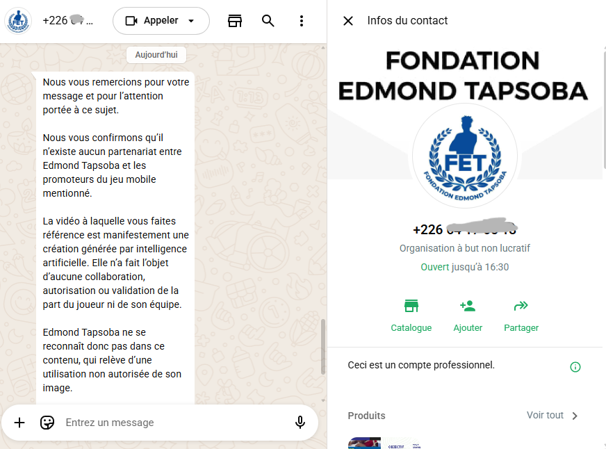 Contactée, la Fondation Edmond Tapsoba a redit qu’il n’existe aucun partenariat entre Edmond Tapsoba et les promoteurs du jeu mobile. “Edmond Tapsoba ne se reconnaît donc pas dans ce contenu, qui relève d’une utilisation non autorisée de son image”, a-t-elle répondu.