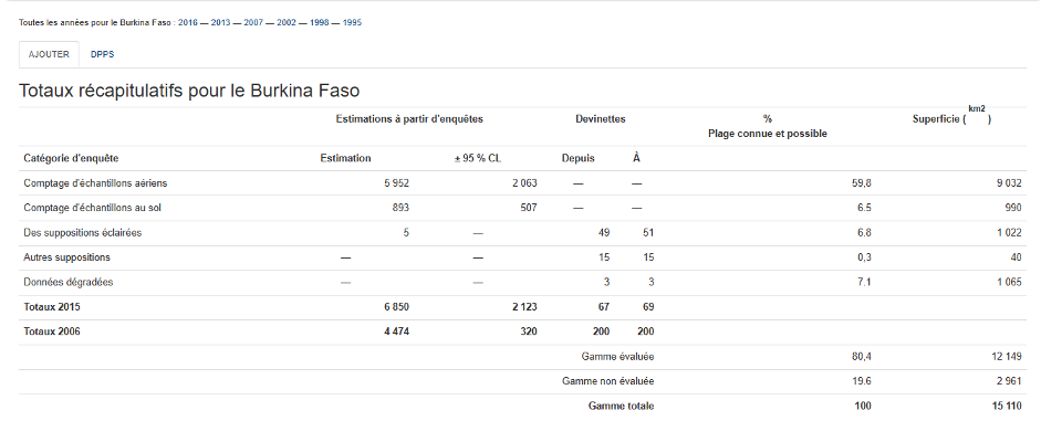 Selon le rapport “African Elephant Status Report 2016” de l’IUCN publié en 2016, mais dont les données concernent l’année 2015, le Burkina Faso abritait la plus grande population d’éléphants d’Afrique de l’Ouest, avec une estimation de 6 850 individus avec une marge d’erreur statistique de ± 2 123 individus. Cela s’explique, selon Jacques Somda, chargé de Programme de l’IUCN au Burkina Faso, par le mode d’obtention de ces données : comptage aérien, pédestre et via des entretiens avec les communautés locales. “Si des éléphants sont repérés par avion et que les témoignages des habitants confirment leur présence, on conclut à l’existence de ces animaux dans la zone. Les éléphants étant des espèces migratrices capables de parcourir des milliers de kilomètres, une marge d’erreur de ± 2 123 a été intégrée aux estimations pour tenir compte de leurs déplacements”, a-t-il expliqué.