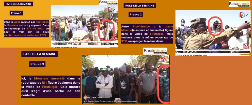 La vidéo qui circule actuellement sur les réseaux sociaux provient en réalité d’une manifestation de mécontentement des parents des victimes, organisée à l’époque lors des obsèques. Elle a été remise au goût du jour pour faire croire qu’il s’agit d’un enterrement récent de membres des Forces de défense et de sécurité.