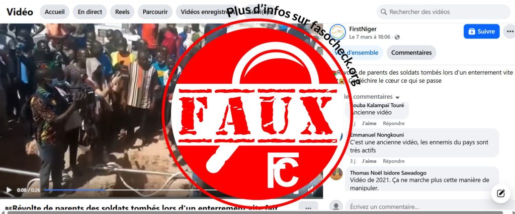 Sur Facebook, une vidéo publiée par la page FirstNiger le 7 mars 2026 crée une polémique. D’une durée de 26 secondes, elle présente une foule de personnes, dans un cimetière manifestant leur mécontentement. Un homme de dos déclare : “en temps que dernière demeure, regardez la profondeur du trou, pour des gens qui sont morts pour la patrie”. Devenue virale (1,2,3,4), les auteurs tentent de faire croire aux internautes qu’il s’agit d’un événement récent qui a causé une : “Révolte de parents des soldats tombés lors d’un enterrement vite fait (…)”.