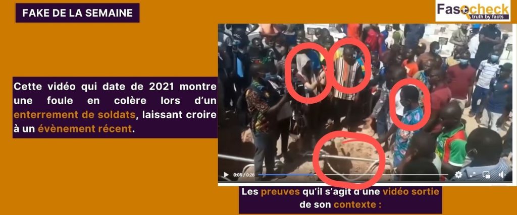 La vidéo présentée comme étant une inhumation récente de soldats, au cours de laquelle des parents de victimes ont dénoncé les conditions d’enterrement, est trompeuse. Elle a en réalité, été sortie de son contexte. Cette séquence remonte à 2021, lors de l’enterrement de gendarmes au cimetière municipal de Gounghin, tués lors de l’attaque terroriste du 14 novembre 2021 à Inata, dans le nord du Burkina Faso. La vidéo provient précisément d’une manifestation de mécontentement de proches des victimes au moment des funérailles. Elle est aujourd’hui remise en circulation pour faire croire qu’il s’agit d’un événement récent.